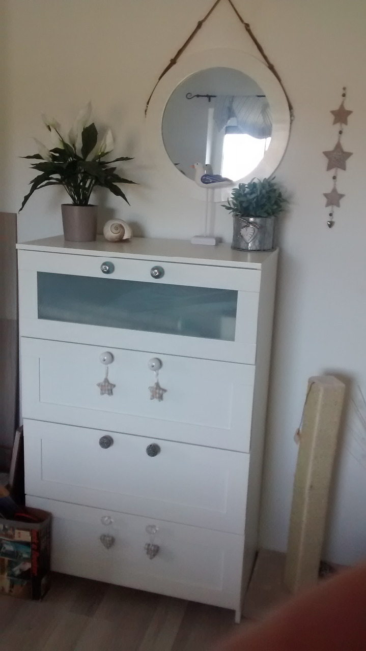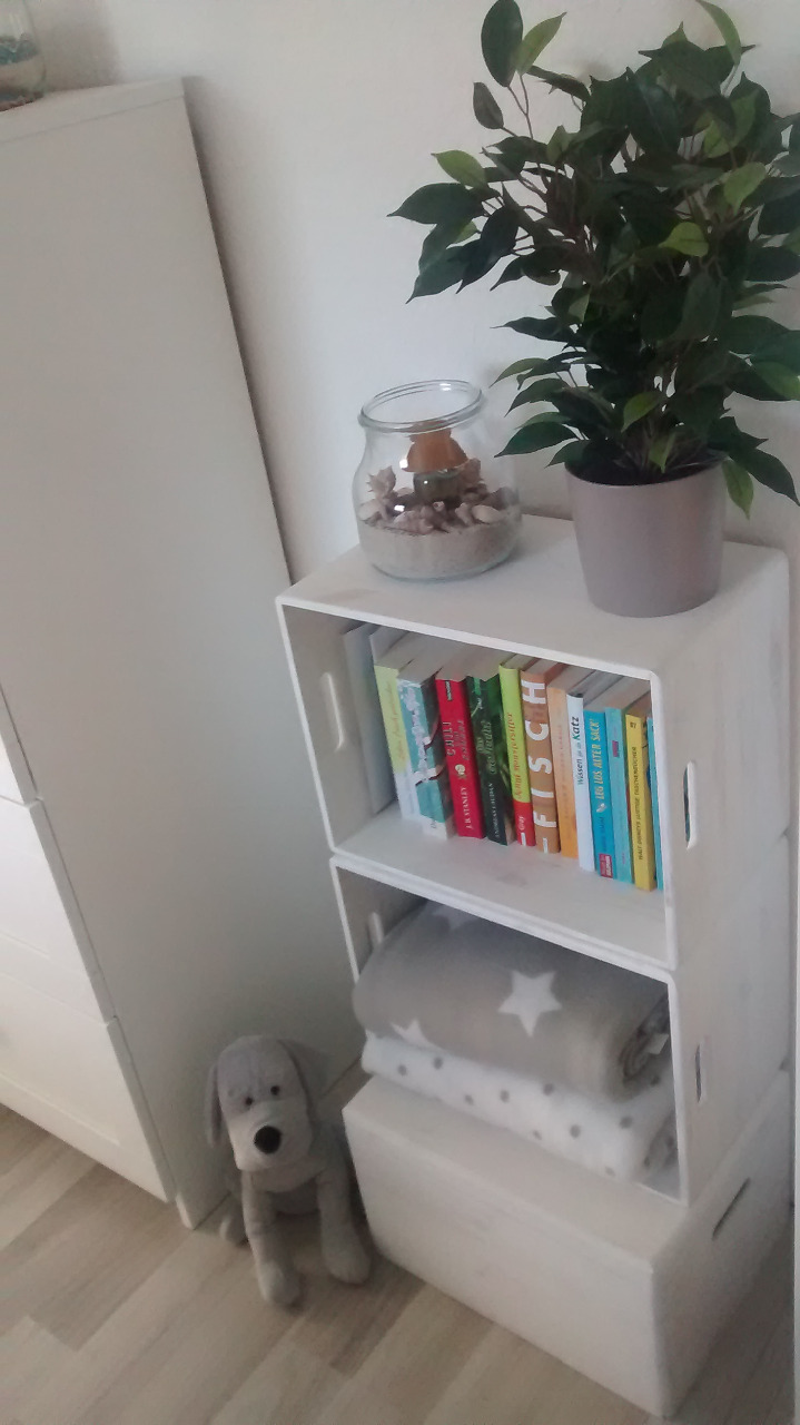 Den ehemaligen Nachttisch (IKEA, Modell HOL) aus dem Schlafraum haben wir behalten. Er wurde weiß lasiert und durfte erstmal ins Wohnzimmer umziehen - er ist ideal für Krimskrams.