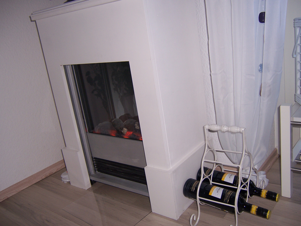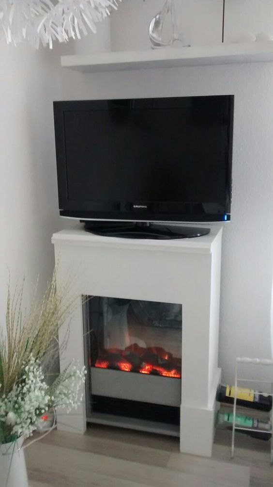 Der alte TV-Schrank flog raus und stattdessen haben wir nun einen elektrischen Kamin. Der Kamin stand schon seit vielen Jahren nutzlos in Hamburg herum. Mit neuer (selbstgebauter!) Kaminkonsole in weiß und dient der Kamin nebenbei als TV-Board.