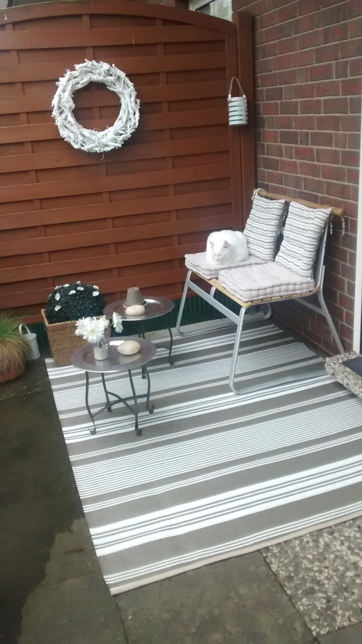 Die Terrasse habe ich vom Laub befreit und dann wurden die Gartenbank, die Tischchen und der Balkonteppich in den Schuppen geräumt.