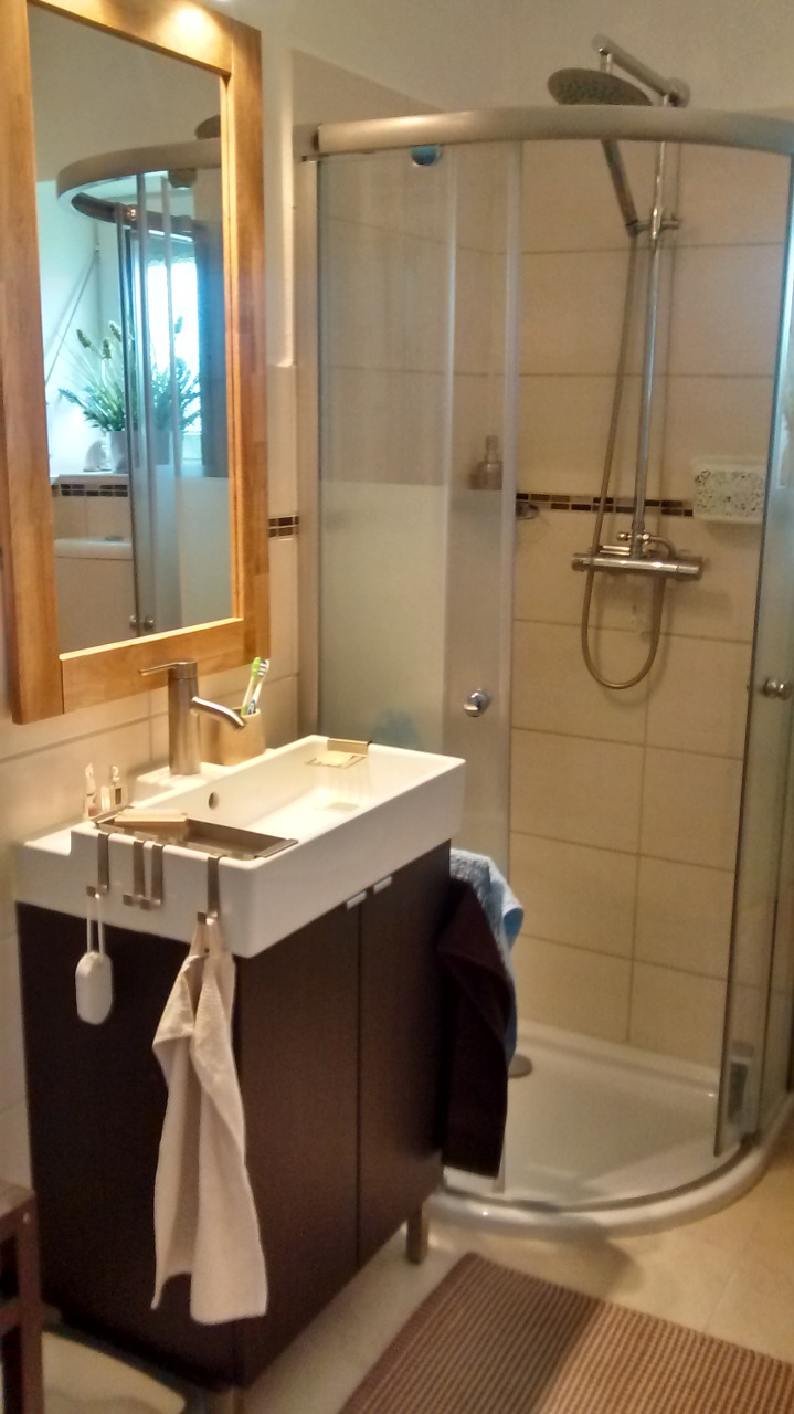 Im Bad blieben Dusche und WC unverändert. Allerdings gönnten wir uns einen neuen Waschtisch (ausnahmesweise nicht in weiß!), einen großen Spiegel und ein kleines Regal für Kosmetik und Handtücher: