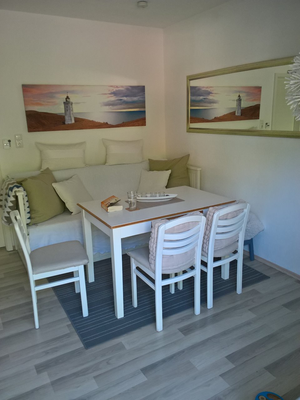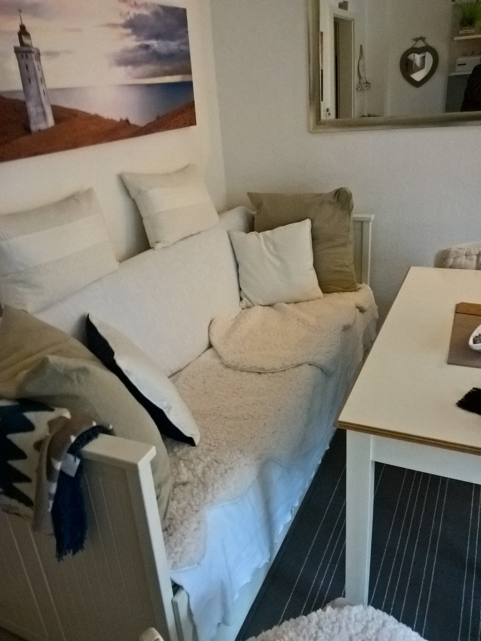 Ein Teppich, ein Leuchtturm-Bild und ein großer Spiegel für die Wand - perfekt!