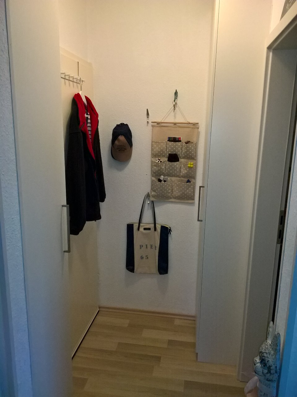Der kleine Flur bekam - nachdem wir zwei riesige Wandschränke und eine Wandgarderobe rausgerissen hatten - nur eine einzige Kommode für unsere Klamotten. Das alte Schuhregel fand erstmal einen Platz versteckt hinter der Tür.
