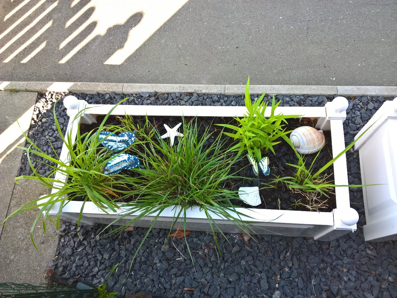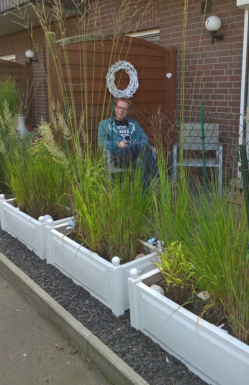 Die FeWo Nr. 1 hat inzwischen auch die Kirschlorbeer-Hecke entfernt und -witzigerweise- die gleichen weißen Pflanzkisten aufgestellt - allerdings mit hohem Rankgitter, was mir nicht so gut gefällt.