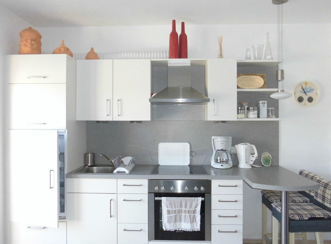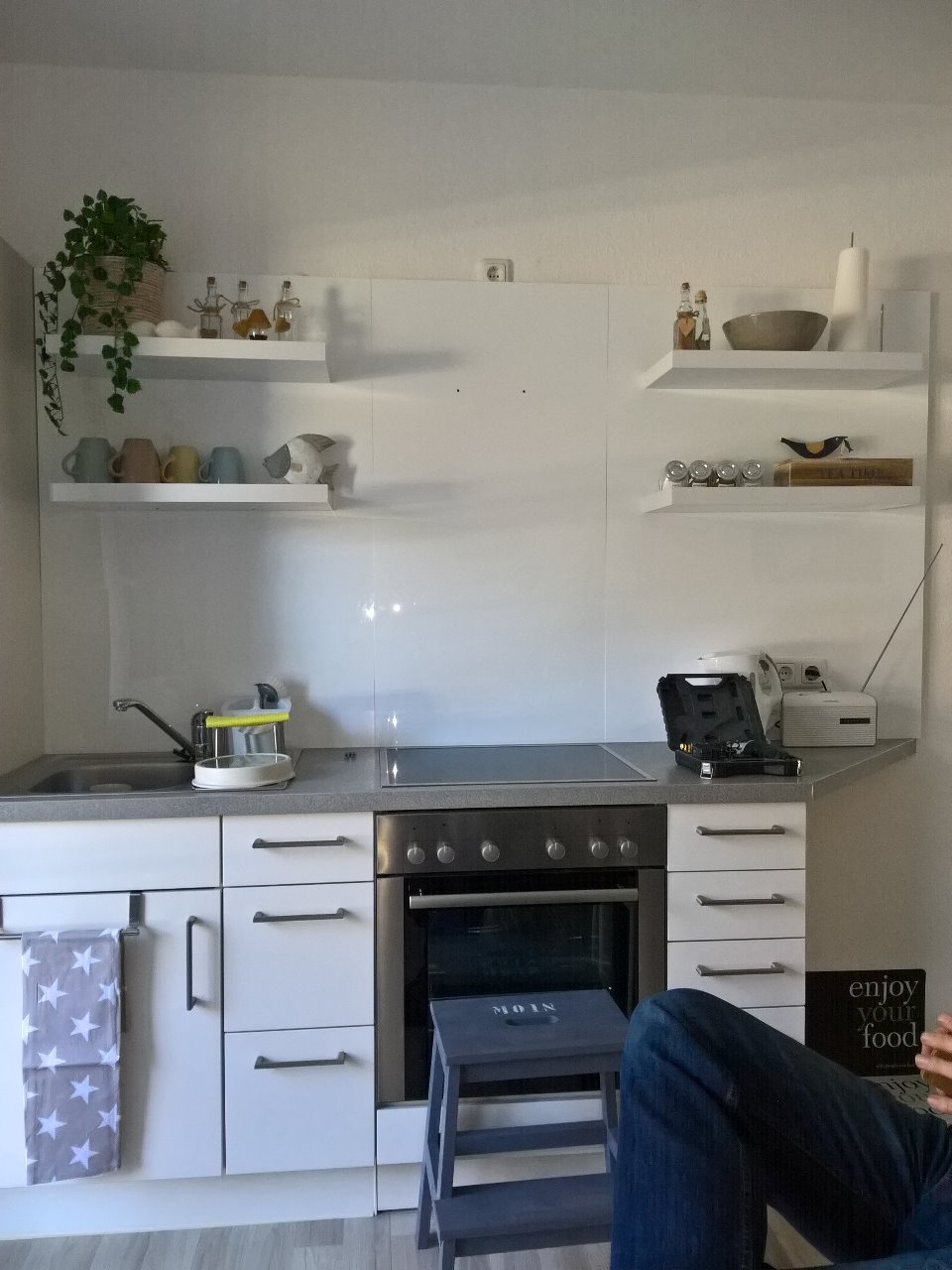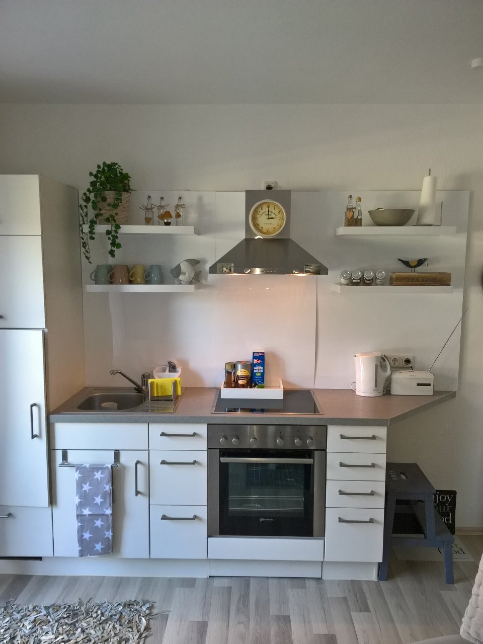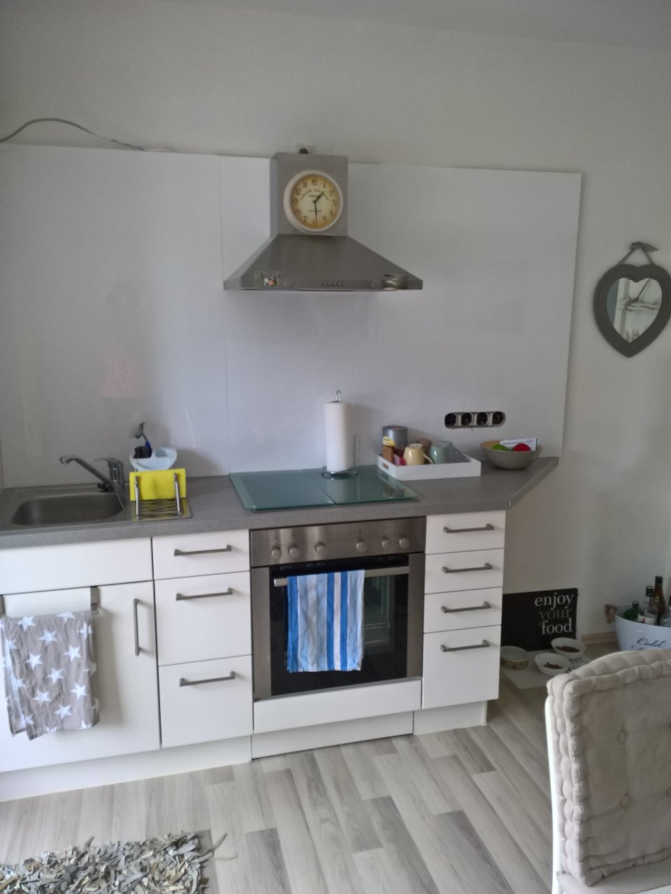 Da wir in das Mietobjekt nicht investieren wollten, haben wir uns ein Alternativ-Zuhause geschaffen (alles weiß und hell, neue Einbauküche, Glas-Duschkabine, weiße Fenster & Türen...)