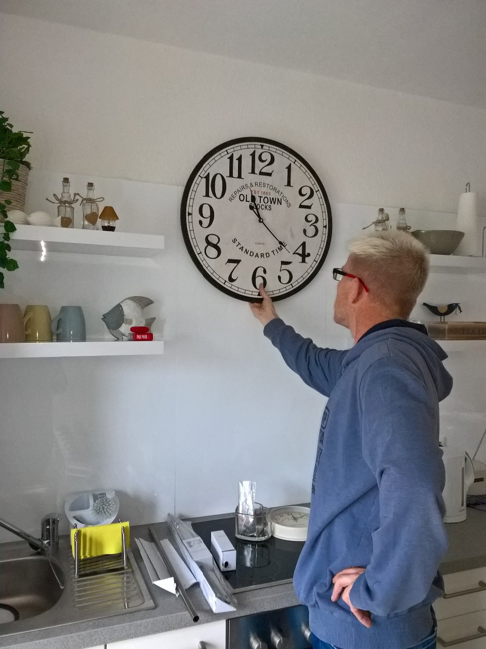 Dann besprachen wir die Anbringung der Küchenreling und machten mal eine Hängeprobe für die große Uhr, die -nach meinen Wünschen- an die Küchenwand sollte. Ja, das sieht doch gut aus...vielleicht noch etwas tiefer...so dass die Regale mit der 3 und 9 auf einer Höhe sind... jaaaa!