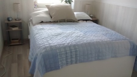 Ins Schlafzimmer kam ein BRIMNES-Doppelbett mit 140cm Breite. Dazu gesellen sich 2 kleine Nachttische.